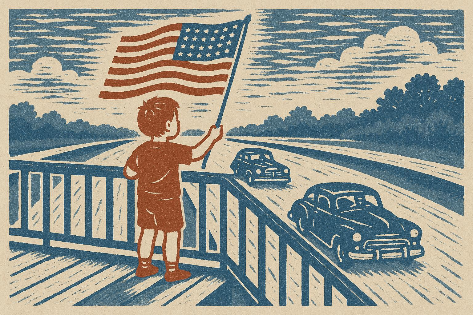 12:00 noon - Flag Waving on the Overpass! This beloved tradition has all of us on the unused overpass next to the farm (and accessible by any manor of animal or machine from the farm, often some kind of trailer), waving flags to the enthusiastic drivers on the great I-35!